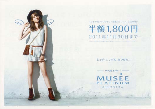 季節柄なのか、今元気のある商品なのか通販化粧品とよばれるジャンルの折り込み広告が多く、元気を感じます。今月のチョイスもその通販化粧品ですが、その前に下に表示した3点の折り込み広告をご覧ください。今月の「Kanebo cosmillono」とカテゴリーは同じ物なのですが、3点のデザインレイアウトが裏表共にほとんど同じ事に驚きます。同じ代理店が制作しているのか?成功例にならい柳の下の何かを狙っているのか分かりませんが、製品に対しての特性を考慮した広告戦略を感じないのは確かでしょう。その中で一際個性を放っているのが今月の一品(作品)です。背景のイメージは何かよく分かりませんが、深い空間を出す事は成功しています。製品を中心に山形に置いてアイキャッチにして、左上から横書きでキャッチコピーを流しています。視線を左上から対角線上に右下隅へ誘導していますが、右下のゴール地点には右向きの矢印があり、広告の裏面へと強く誘導しています。この広告のデザインは裏面への誘導が第一義として捉えていることがこれで分かると思います。中央部の縦書きの明朝体文章は、製品の信頼性と安心感を読み手に与えています。また、左下隅に五角形の矢印状の形がありますが、右の矢印と目的が違うので形状を分けています。同じ形状を使う際は同じ目的物である事が重要です。この様に混同させずに上手く分けるのはデザインの上級テクニックです。