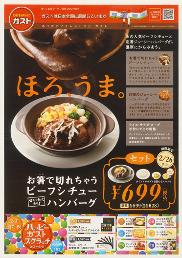 今月のチョイスは三つ折りの観音開き広告です。仏具を安置する厨子を開くように左右に開くことから観音開きと呼びます。新聞折り込み広告には二つ折りくらいまでは比較的多く見受けられますが、それ以外の折はパンフレットなどに使う事が多く、折り込み広告には珍しいタイプです。三つ折りのパンフレットは開きの左右の違いもありますが、大きく分けて巻き三つ折り、外三つ折り(蛇腹折り)、三観音折り、の3種です。ただ一枚の紙を折るだけではなく表紙から2回開く事でそれぞれの局面を変え新しい世界を見せる工夫が出来る事が特徴です。どの方法も全部で6面の切れ変わりがあり、小さな6ページの冊子と考えると良いでしょう。巻三つ折りは1回目の開きで裏の3分の一が残り、2回目で中の全てが現れます。それに対して、外三折りは表と裏を同時に表示する場面はありません。ですので、裏と表の情報が全く違う場合や、裏面は1色の印刷などに向いています。どちらも紙の三分の一が表紙になりますが、版下の作り方が違いますので注意が必要です。