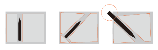 鉛筆を紙の上に置いたと想定してみます。シルエットにした鉛筆は簡単に認識できるはずです。中央の図のように少し鉛筆を曲げてみると「動き」を感じるでしょうか。右側では鉛筆を拡大して画面よりはみ出させてみました。何故、動きを感じるのでしょうか。