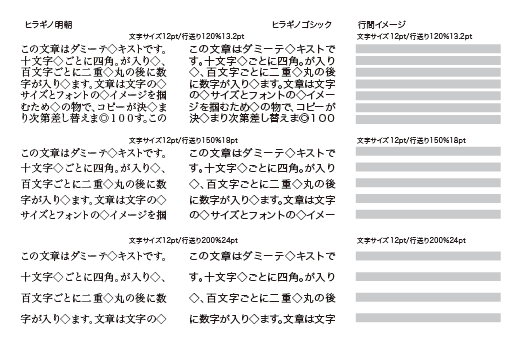 普通文字を書くと、書いた文章は気になりますが、書かれなかった部分を気にする人は少ないでしょう。下の図は12ポイントの文字と行間の関係を示しています。右側の文字部分をグレーのラインとすると、ラインの隙間が行間となります。